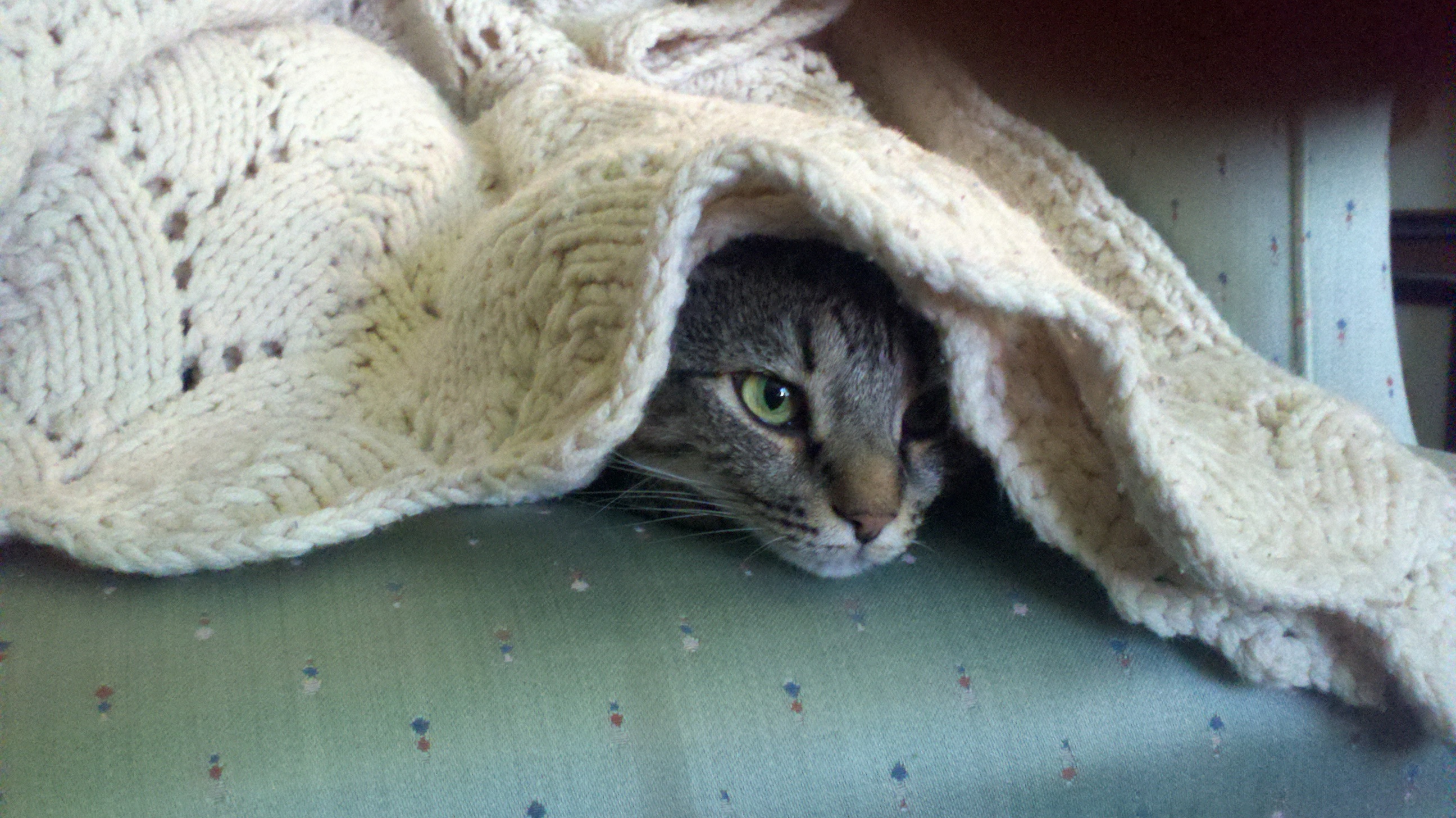 • Yay for tabby cats! We’ve got two of ’em, but only Val likes to get under the covers. She’s so funny about it, too. She gets all the way under and falls asleep so contentedly that I feel the need to lift up the blanket periodically to make sure she’s still breathing. When I do, she gives me this “Do you mind?” look until I let her get back to her slumber.