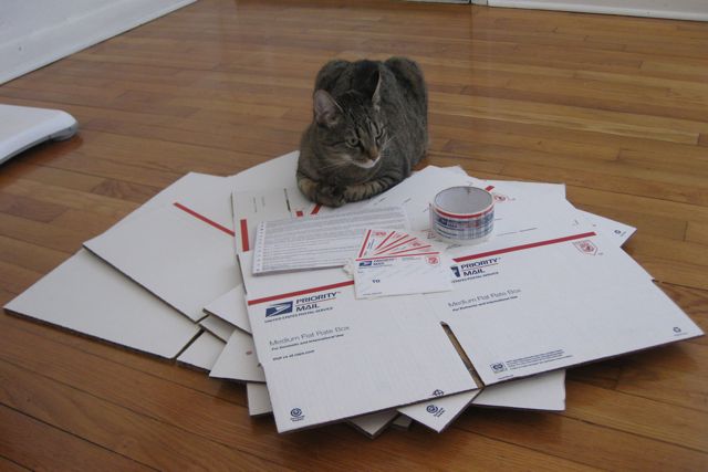 It really is a comprehensive kit: assorted Priority Mail flat-rate boxes, address labels, customs forms, the little plastic sleeves for said customs forms, and even a little roll of Priority Mail tape to tie everything together. Everything arrived on my doorstep, neatly wrapped and at no cost to me. Of course, I will still need to pay postage to actually mail the packages, which is no doubt a big part of why the USPS is so happy to give us the kits gratis.